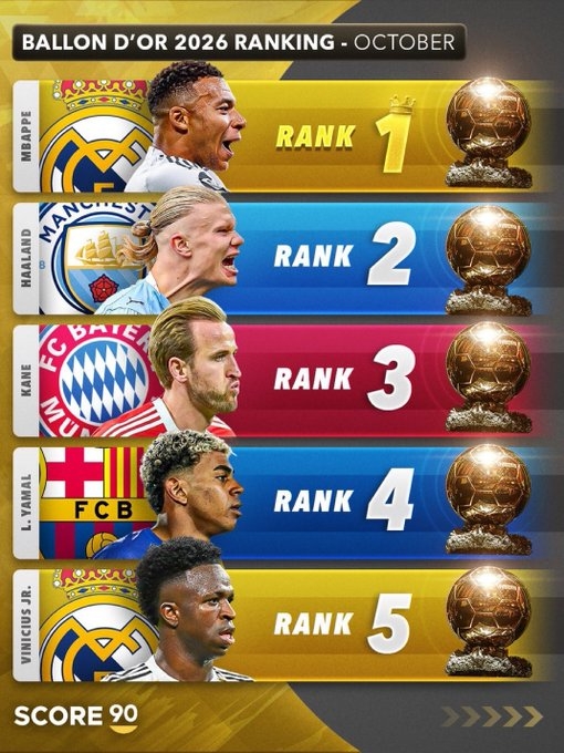 👀外媒发布2026年金球奖首期实力排名:姆巴佩居首,亚马尔第四