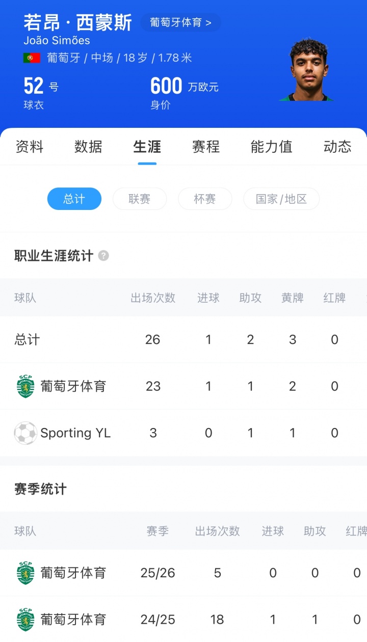 若昂-西蒙斯现身价600万欧,上赛季他为葡体一线队出场18次,贡献1球1助,他与葡体的合同在2030年到期,解约金8000万欧。