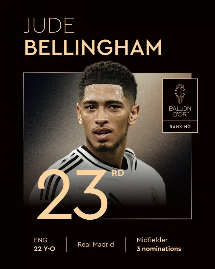 23、贝林厄姆(皇马/英格兰、22岁、第三次获得提名)