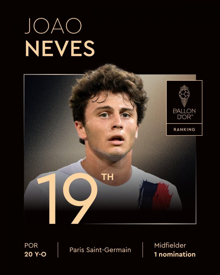19、若奥·内维斯(巴黎圣日耳曼/葡萄牙、20岁、第一次获得提名)
