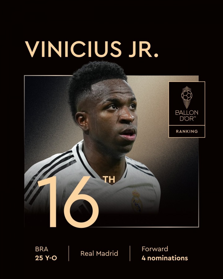 16、维尼修斯(皇马/巴西、25岁、第四次获得提名)