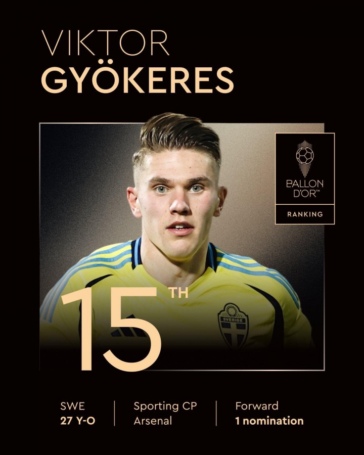 15、约克雷斯(葡萄牙体育/阿森纳/瑞典、27岁、第一次获得提名)