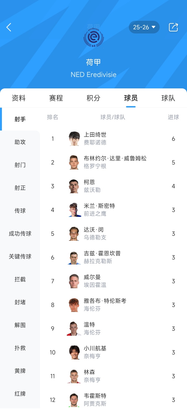荷甲射手王❗上田绮世7轮6球领跑射手榜,荷甲榜首铁主力五号位🍋