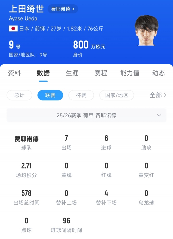27岁的日本前场球员上田绮世本赛季竞技状态 火热,荷甲7轮赛事 打进6球,欧洲杯直播领跑职业联赛 射手榜。2023年夏窗,费耶诺德以800万欧元的转会费签下上田绮世,加盟至今他共代表球队出战77场赛事 ,贡献20球4助,目前德回转 价800万欧元。