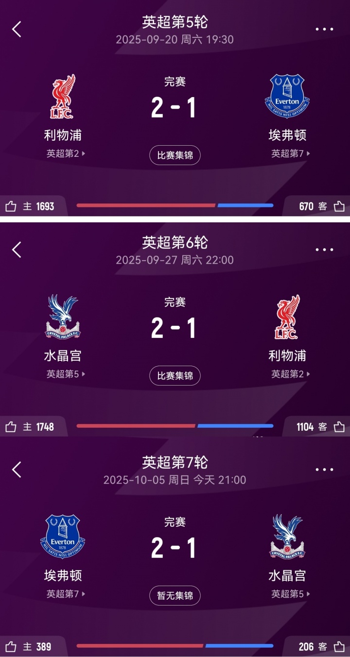 形成了闭环😅利物浦2-1埃弗顿2-1水晶宫2-1利物浦