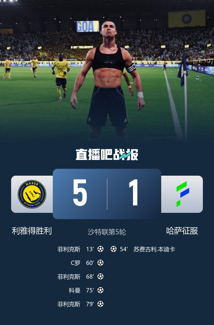 沙特联第5轮,利雅得获胜 5-1大胜哈萨征服,菲利克斯独中三元,C罗世界波。