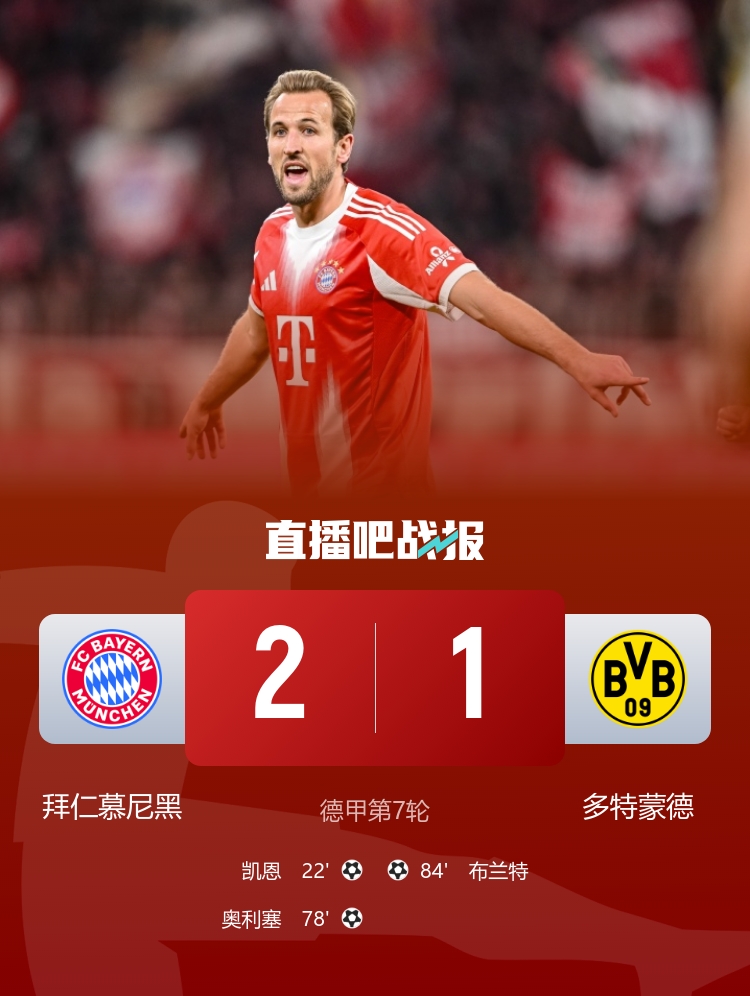 德甲第7轮,拜仁2-1多特蒙德拿下德国国家德比,凯恩、奥利塞得分 。