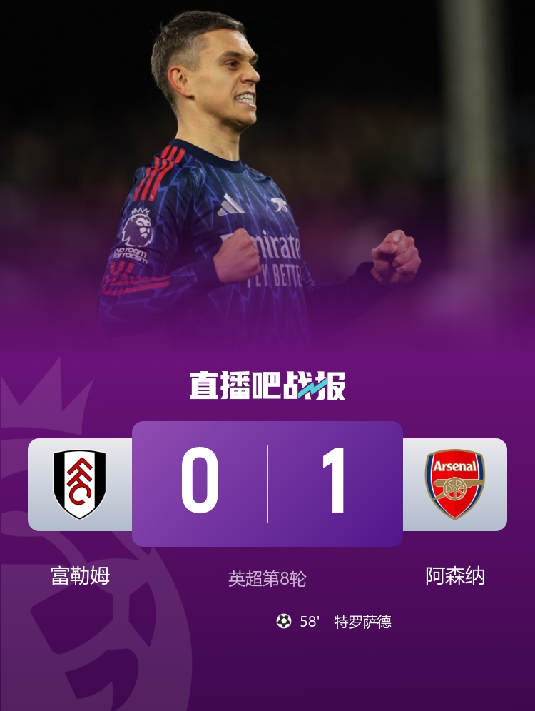 英超职业联赛 第8轮,阿森纳1-0小胜富勒姆,特罗萨德制胜。