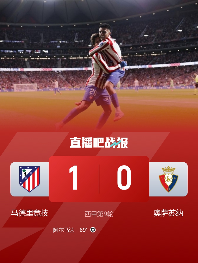 西甲-马竞1-0奥萨苏纳暂升第四 阿尔马达处子球制胜小西蒙尼助功