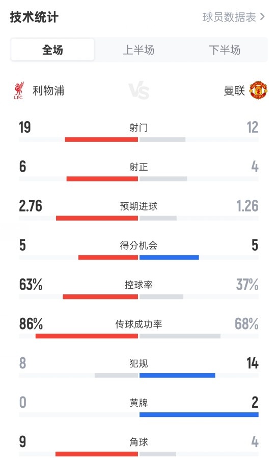 利物浦1-2曼联数据:射球 19-12,射正6-4,盘带时间 63%-37%