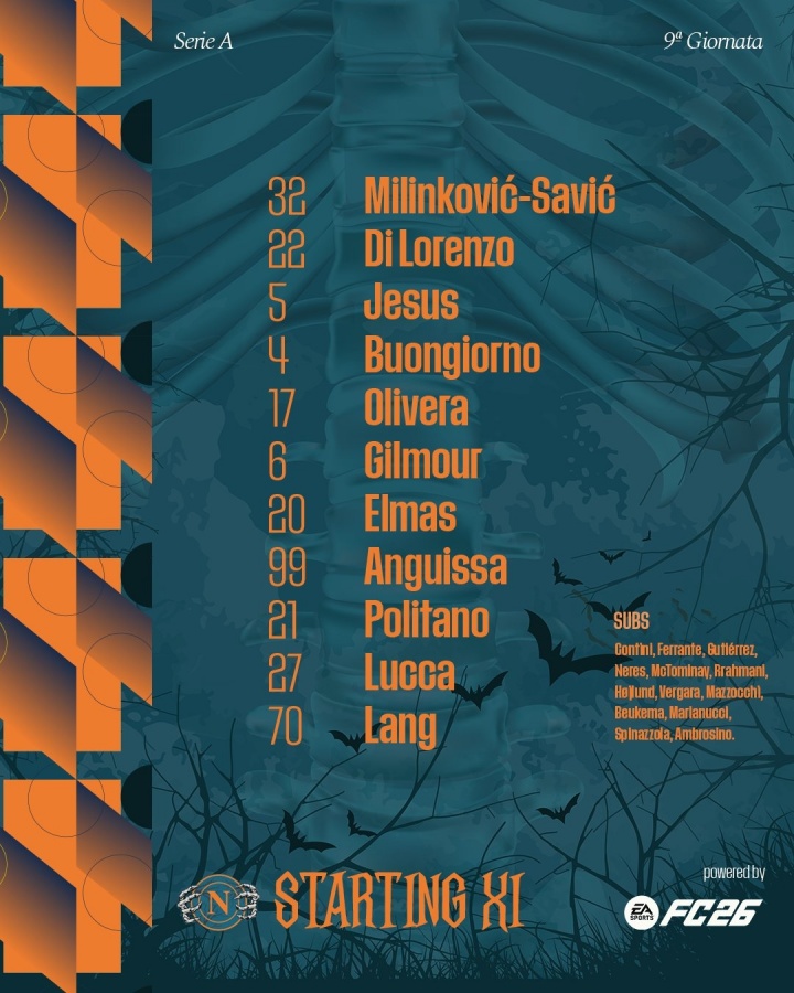 那不勒斯杆位:32-瓦尼亚-米林科维奇-萨维奇、22-迪洛伦佐、5-胡安-热苏斯、4-布翁乔尔诺、17-马蒂亚斯-奥利维拉、6-吉尔莫、20-埃尔马斯、99-安古伊萨、21-波利塔诺、27-洛伦佐-卢卡、70-诺阿-朗