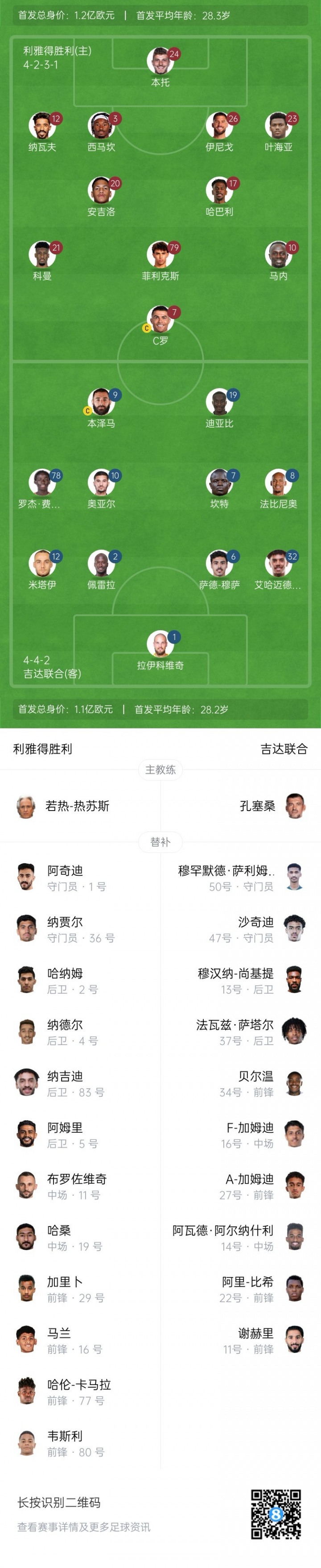 利雅得获胜 杆位:24- 本托、12-纳瓦夫、3-西马坎、26-伊尼戈·马丁内斯、23-叶海亚、17-哈巴利、20-安吉洛、79-菲利克斯、21-科曼、10-马内、7-C罗