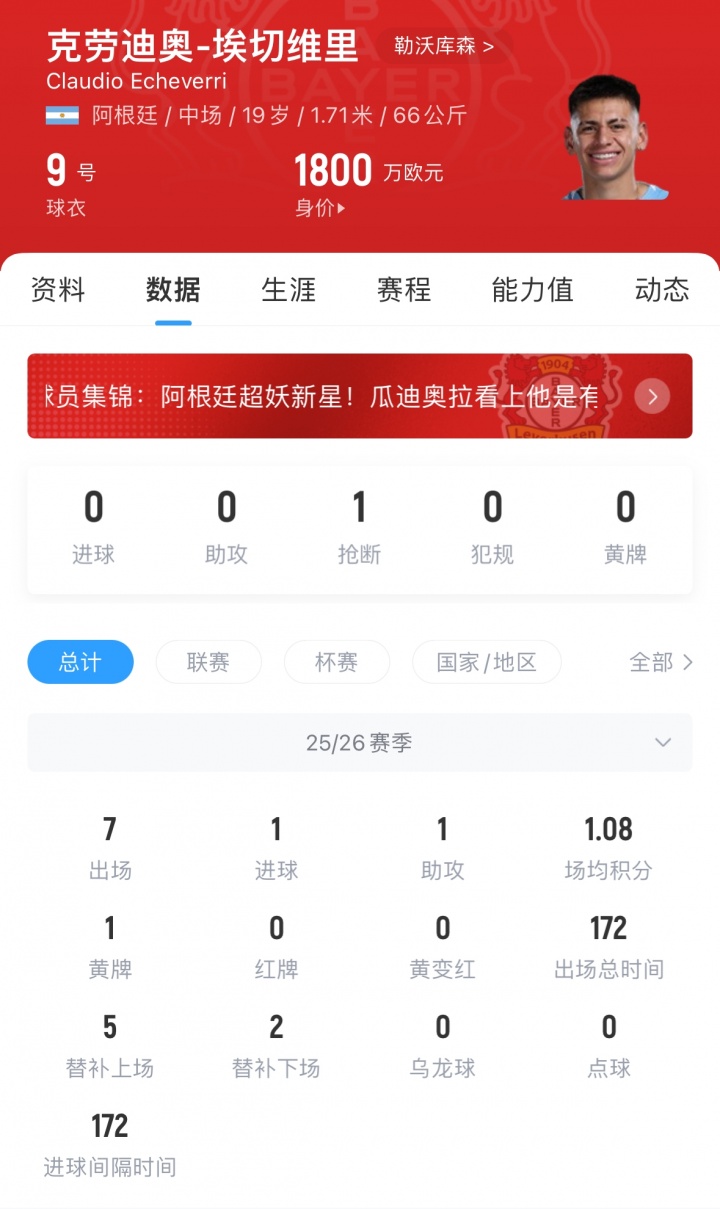 难练级!19岁埃切维里德国杯枯坐板凳,加盟药厂2个月仅踢127分钟