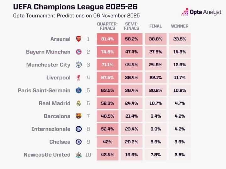 欧冠夺魁 概率:阿森纳超23%断档领跑,拜仁曼城红军巴黎皇马2-6位