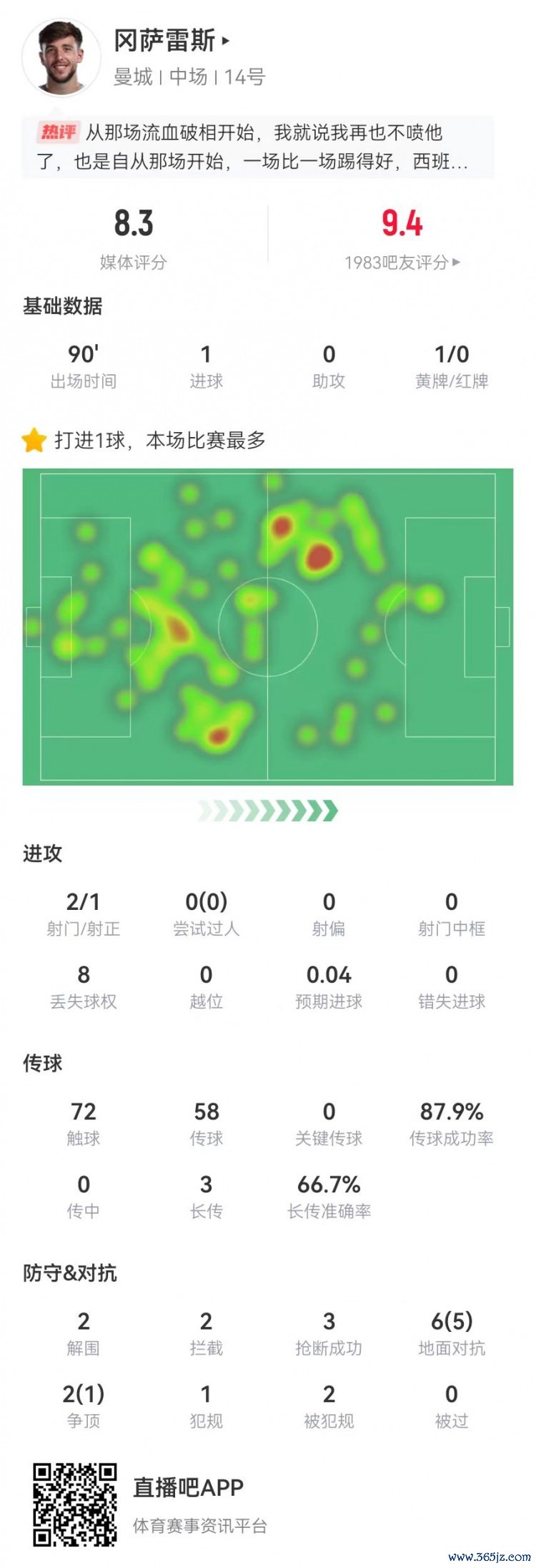 11月10日讯 曼城在本轮英超焦点战3-0完获胜 物浦,尼科-冈萨雷斯本场数据如下: