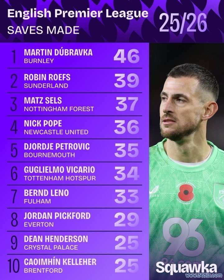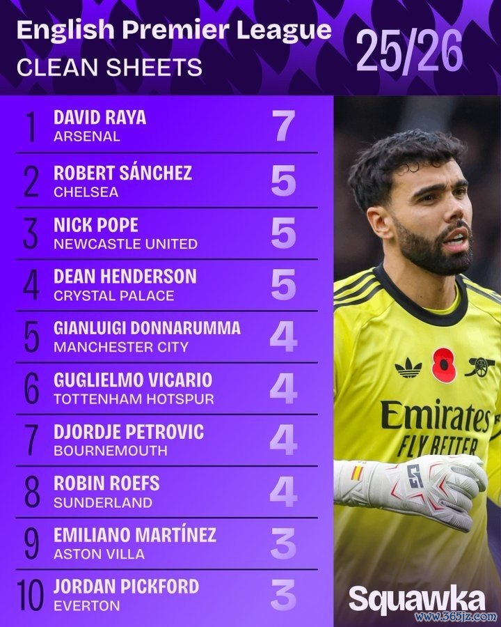 拉亚7场零封是本赛季英超守门员最多,杜布拉夫卡46次抢救 最多