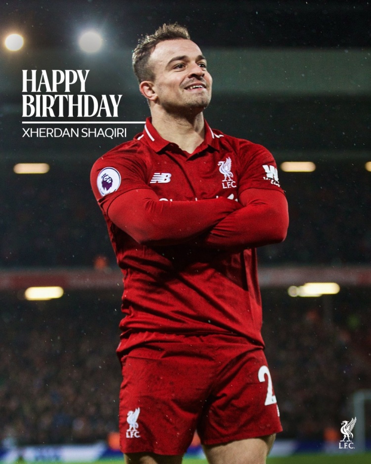 利物浦官方社媒晒出沙奇里的生日海报,配文:“生日快乐,沙奇里。”